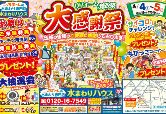 4月4日(土)~5日(日) 10:00~16:00 いつも水まわりハウスをご利用いただき、誠にありがとうございます。 このたび、日ごろの皆様のご愛顧に感謝して「大感謝祭」を開催します! ご来場いただいたお客様には、ご来場特典や見積り依頼特典を先着でプレゼント。 さらに、ロボット掃除機、衣類スチーマーなど豪華賞品の当たる大抽選会にもご参加いただけます! そのほか、トイレットペーパー…