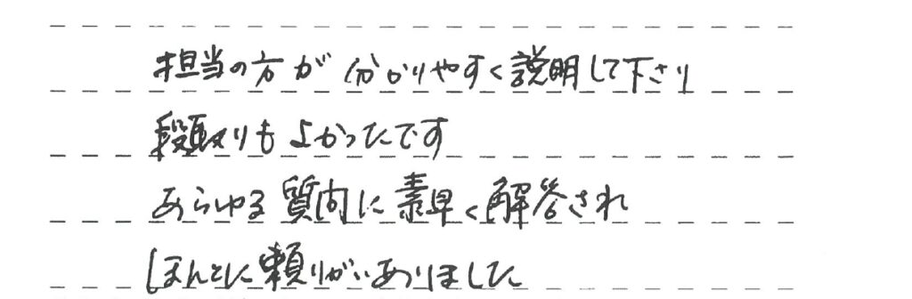打合せから工事までスムーズに対応していただき、次の機会も是非お願いしてみたいと思いました。 営業の方も職人の方も気さくで人柄もよく とても好感がもてました。