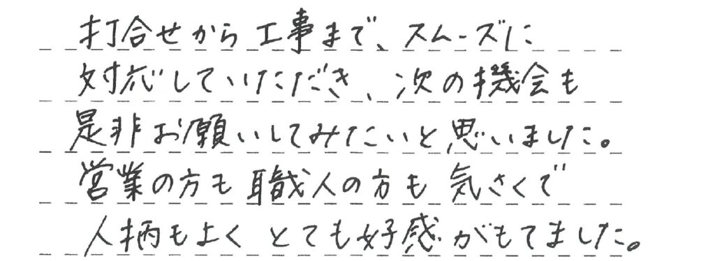 助成金の手続きから工事内容、日程の説明など丁寧に対応して頂きました。 仕上がりも満足しています。ありがとうございました。