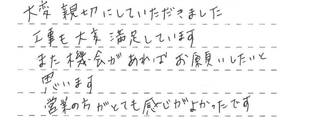 作業もスムーズでとても良い印象を持ちました。 作業して頂いた方も皆さん礼儀正しく安心して作業を任す事ができました。 仕上がりも予想以上に良く大満足です。知り合いにリフォームを考えている方が いたら是非紹介させて頂きます。