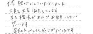 大変親切にしていただきました。工事も大変満足しています。 また機会があればお願いしたいと思います。 営業の方がとても感じがよかったです。
