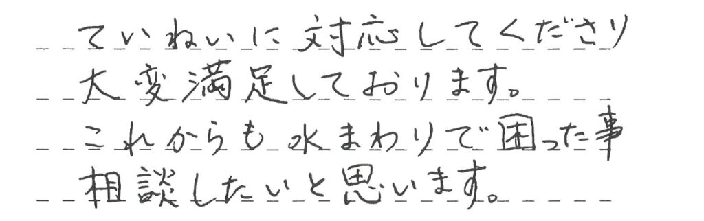 ていねいに対応してくださり大変満足しております。 これからも水まわりで困った事相談したいと思います。