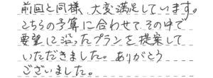 前回と同様、大変満足しています。こちらの予算に合わせてその中で要望に沿ったプランを 提案していただきました。ありがとうございました。