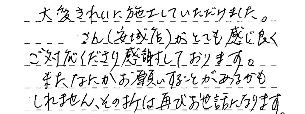 営業・職人さん共、とても良い対応で又是非お願いしたいと思います。 クロスの張り替え、まだ半分残っているのでまた暖かくなったら宜しく。