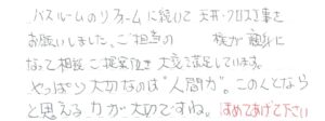 バスルームのリフォームに続いて天井・クロス工事をお願いしました。 ご担当の方が親身になって相談ご提案頂き大変満足しています。 やっぱり大切なのは "人間力"。この人とならと思える力が大切ですね。ほめてあげて下さい。