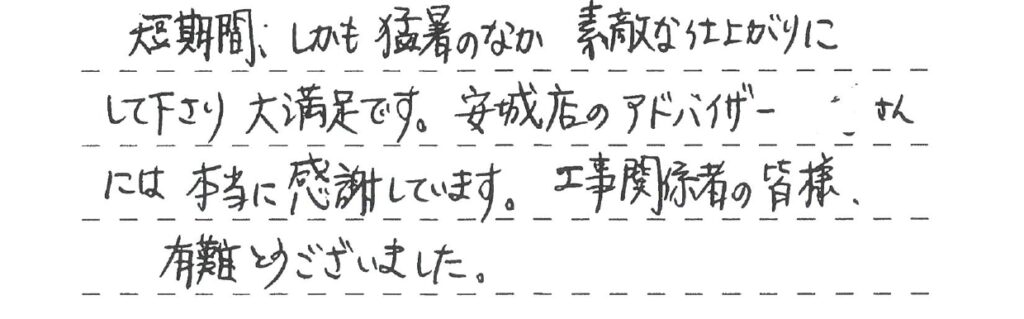 安城の「水まわりハウス」の担当者さんが5日間毎日訪れ、工事の進行を指示されていたので 安心して任せることができました。担当者さんの労に感謝です。