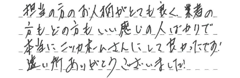 大変親切にしていただきました。工事も大変満足しています。また機会があればお願いしたいと思います。営業の方がとても感じがよかったです。