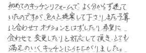 初めてのキッチンリフォームでよく分からず迷っていたのですが 色々と提案して下さりまた予算に 合わせてオプションをはずしたり希望に合わせて変更したりと対応して頂き、とても満足のいくキッチンに仕上がりました。